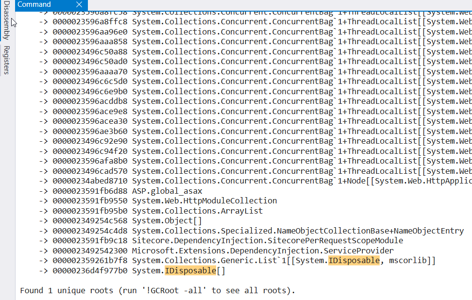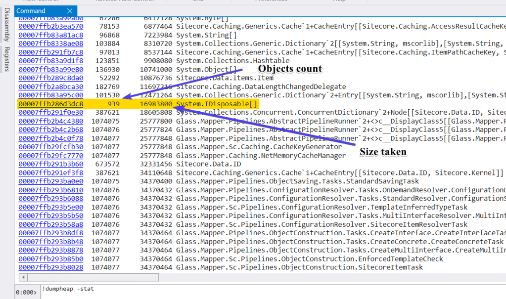 A few IDisposable[] arrays take as much space as 100K objects?! That is over 2200 elements in average (or ~18KB) inside array. There are over 700 huge arrays each having over two thousands disposable elements each, sounds as a code smell.