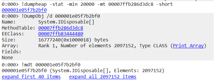 We could either find !gcroots (who holds object in memory) for suspicious classes that have much higher count than expected or look for unexpectedly huge objects in the heap.