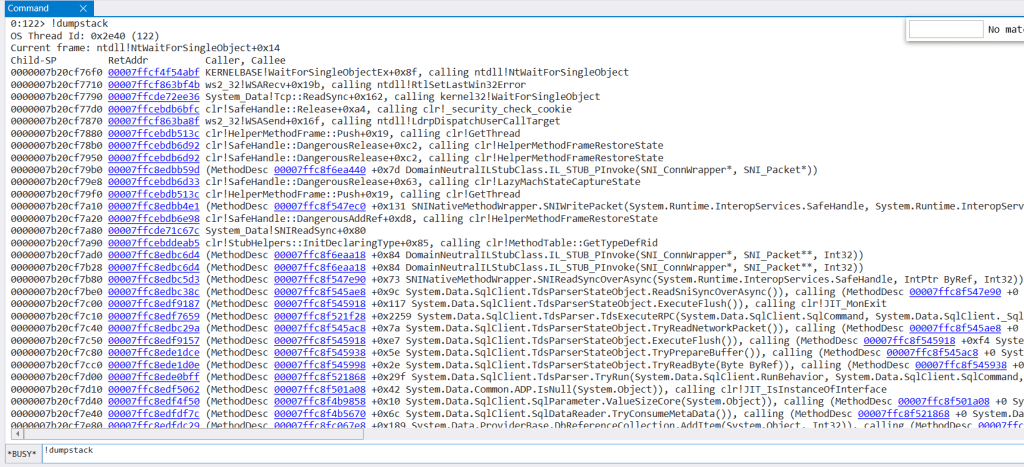 !eestack -ee by SOSEX prints each managed thread call stack: