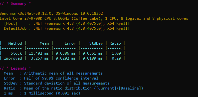 Benchmark.NET test proves the assumption with astonishing results – over 3x speedup: