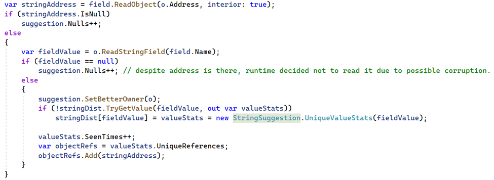 The presence of ‘rooted’ objects that are being used, yet each holds its own copy of the same string. We identified these strings’ owners as application models and modified their setters to use string interning. We opted for a custom interning solution over the built-in .NET mechanism for specific reasons. Upon further investigation, a similar pattern in a number of other models was discovered.